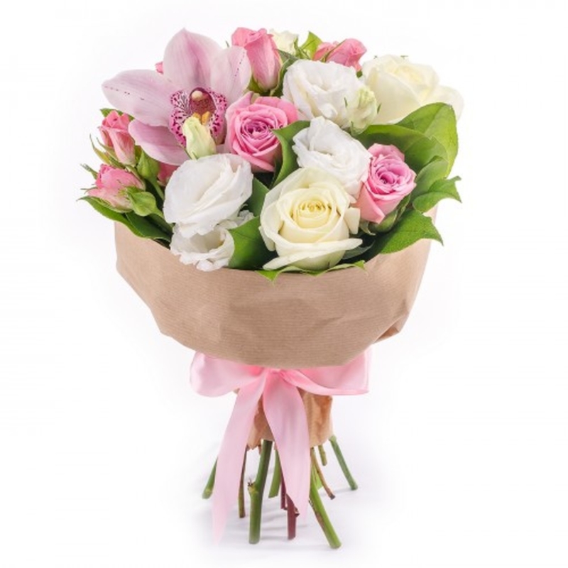 Букет состоит из 8 розовых роз, 3 белые розы, 1 ветка эустомы, 1 орхидея, зелень, крафт, атласная лента.
