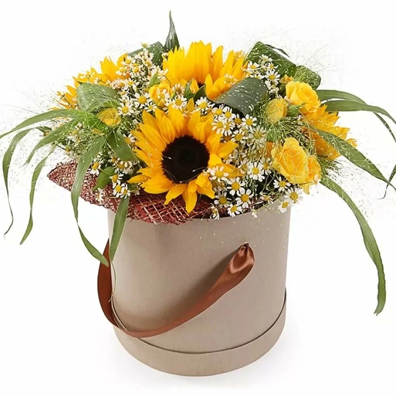 Букет состоит из 5 подсолнухов, 2 желтые кустовые розы, 10 веток танацетума, аспидистра, зелень, коробка, оазис.