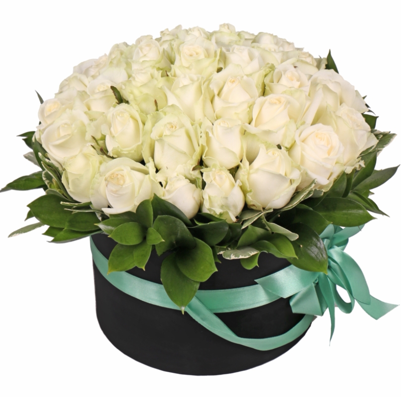 Букет состоит из 35 белых роз, салал, коробка, атласная лента.