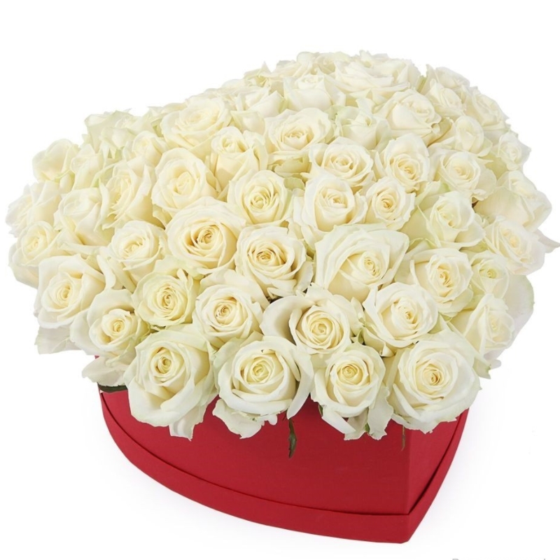 51 белая роза, коробка в виде сердца.