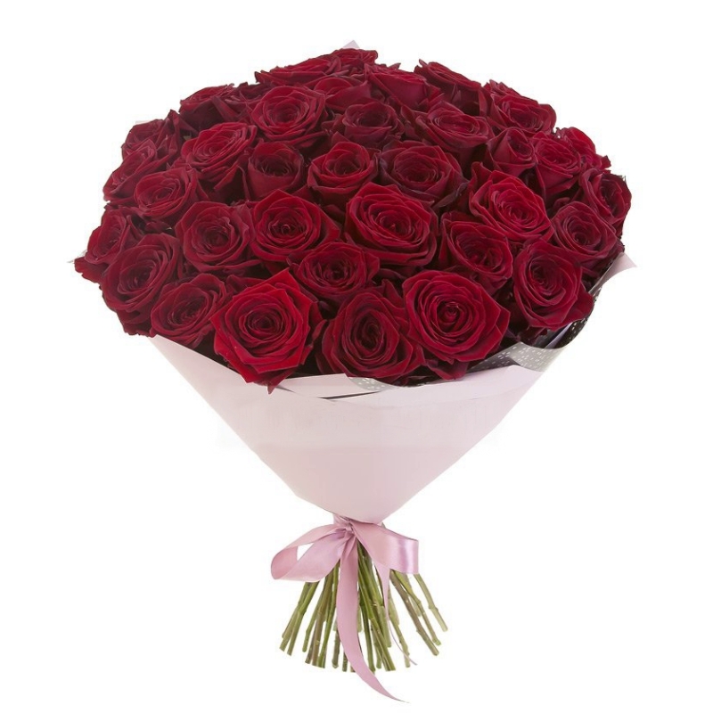 Букет состоит из 37 бордовых роз, крафт, атласная лента.