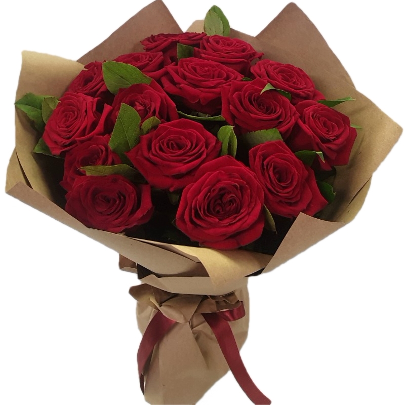 Букет состоит из 17 бордовых роз, зелень, крафт, атласная лента.
