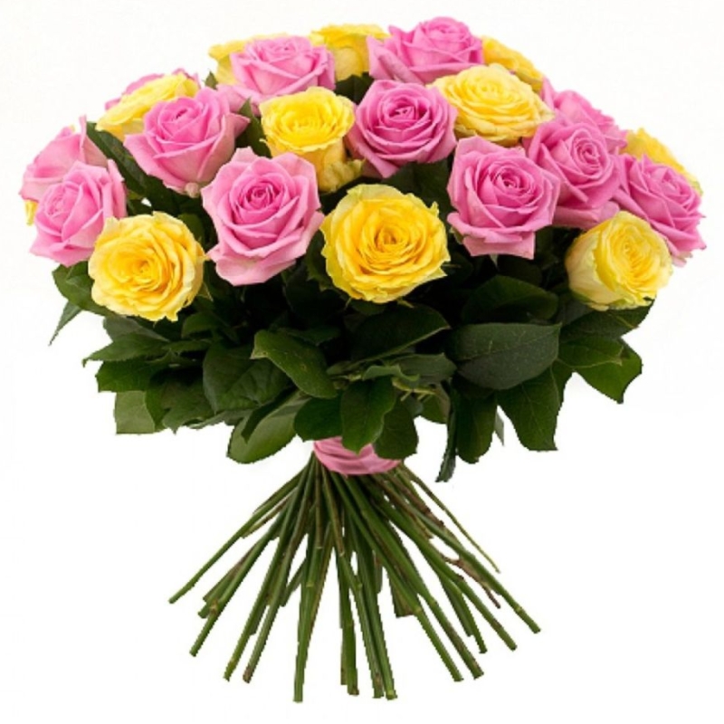 Букет состоит из 13 розовых роз, 12 желтых роз, прозрачная упаковка, атласная лента.