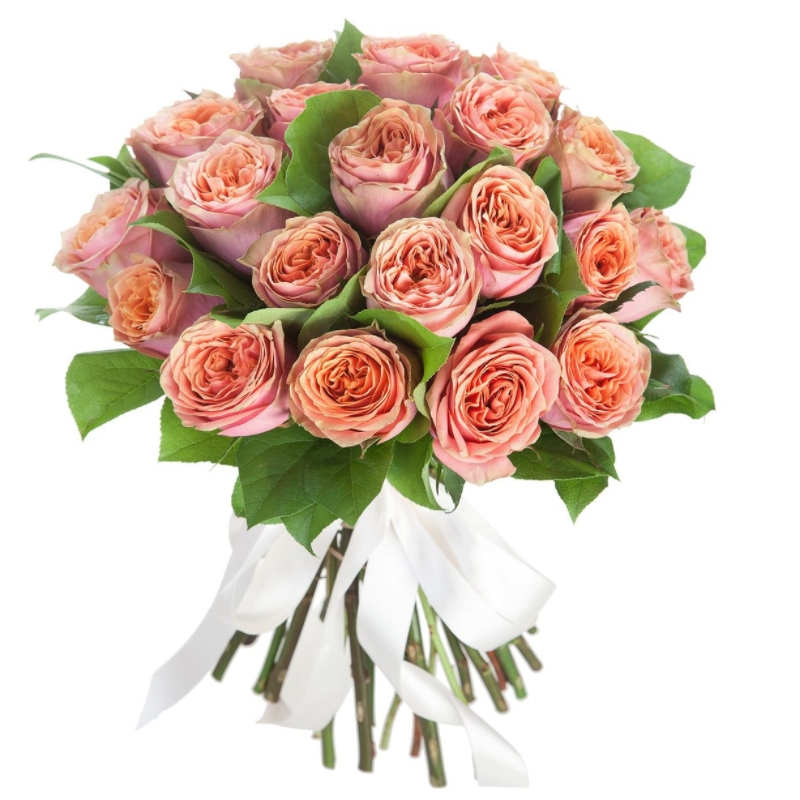 Букет состоит из 21 пионовидная роза, салал, прозрачная упаковка, атласная лента.