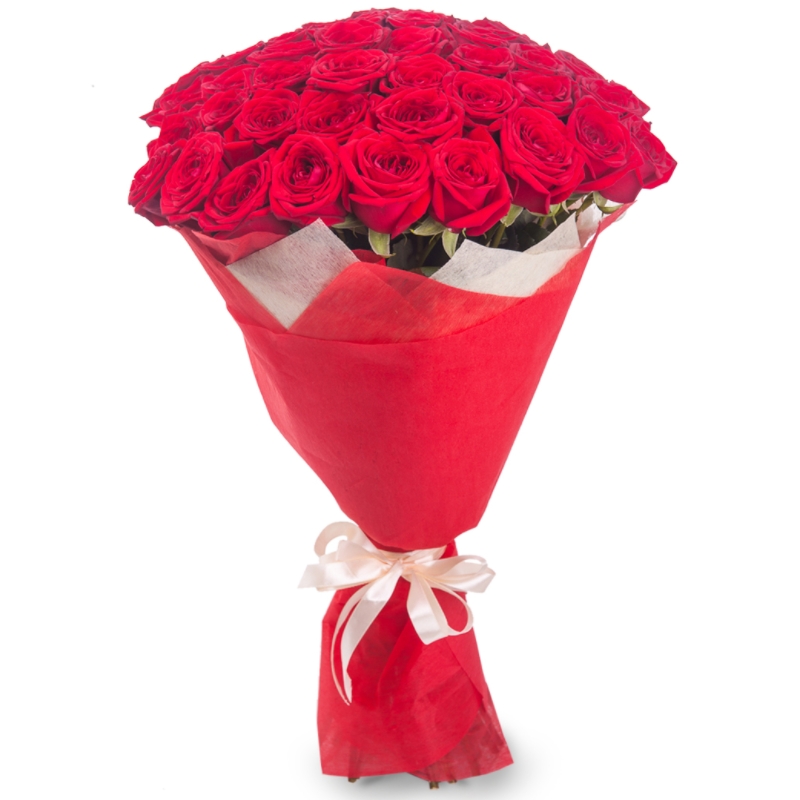 Букет состоит из 55 красных роз, красивая упаковка, атласная лента.