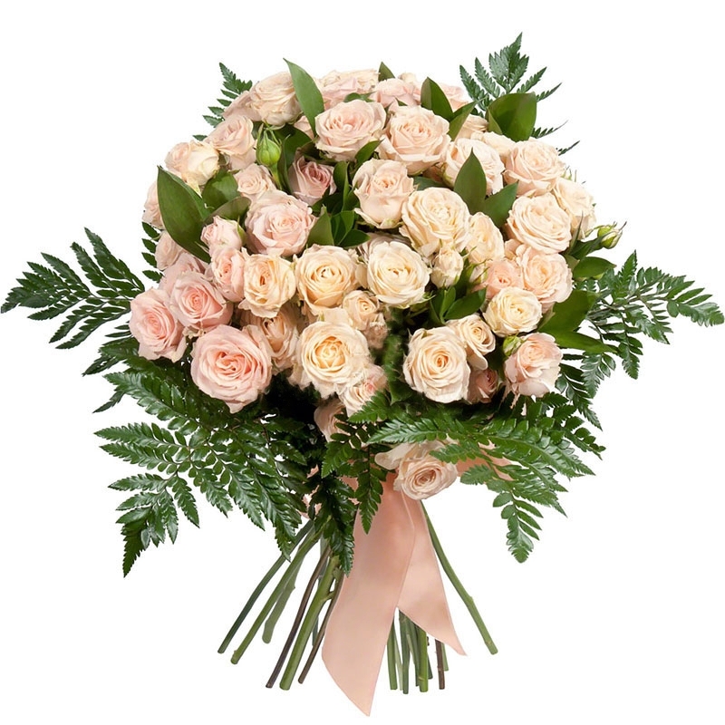 Букет состоит из 11 кремовых кустовых пионовидных роз, зелень, прозрачная упаковка, атласная лента.