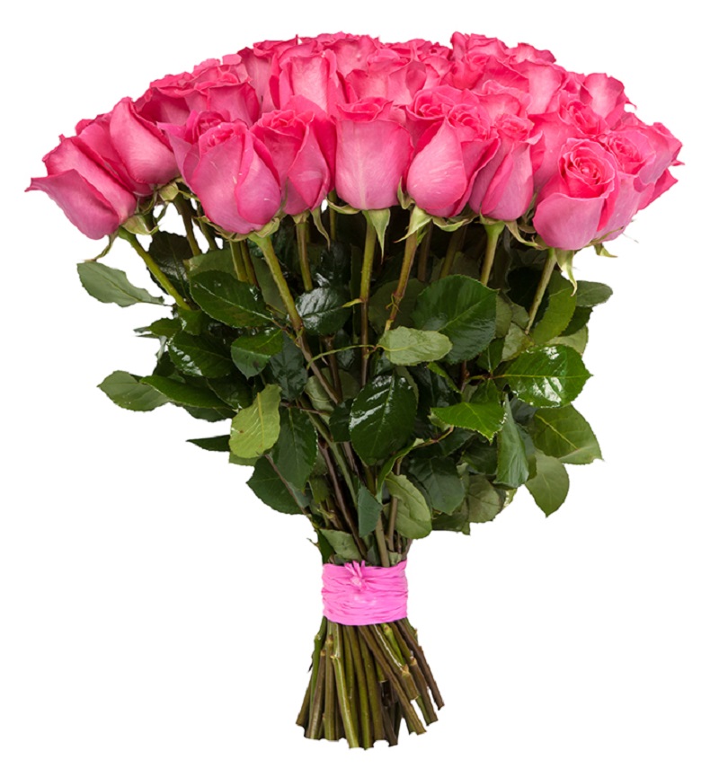 Букет состоит из 55 малиновых роз, прозрачная упаковка, атласная лента.