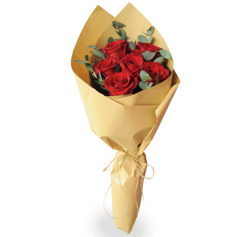 Букет состоит из 5 красных роз, зелень, крафт.