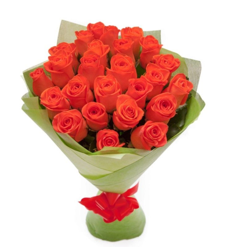 Букет состоит из 25 оранжевых роз, красивая упаковка, атласная лента.
