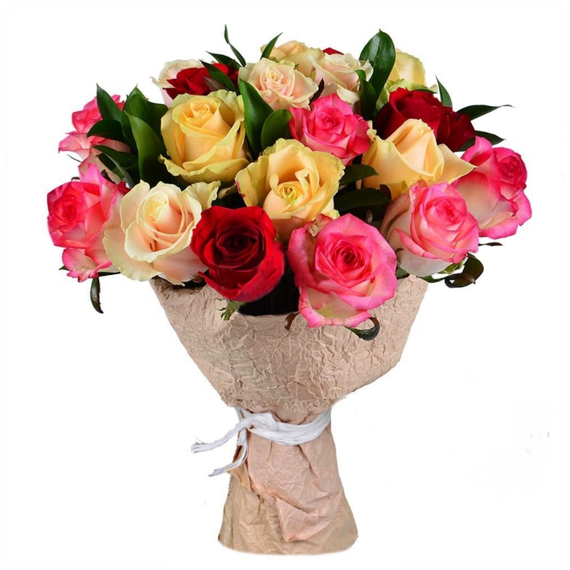 Букет состоит из MIX из 19 роз, зелень, крафт, атласная лента.