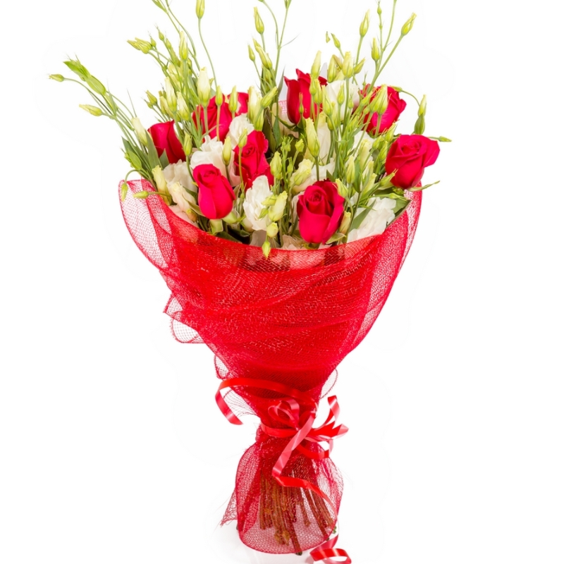 Букет состоит из 9 красных роз, 6 веток эустомы, упаковка, лента.