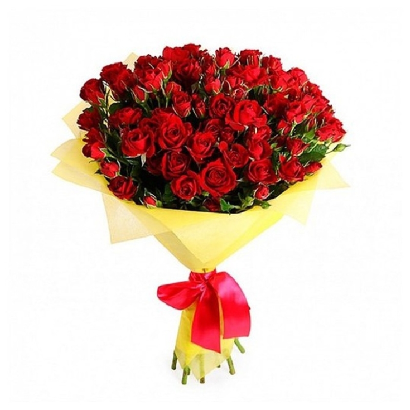 Букет состоит из 13 красных кустовых роз, красивая упаковка, атласная лента.