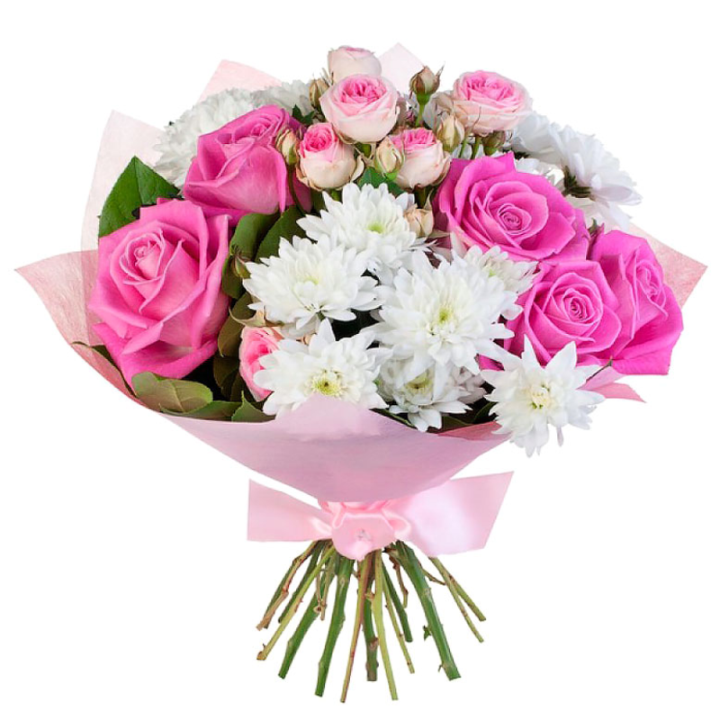 Букет состоит из 5 роз, 1 ветка кустовой розы, 3 ветки хризантемы, зелень, упаковка, атласная лента.