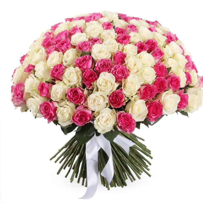 Букет состоит из MIX из 201 белой и розовой розы, прозрачная упаковка, атласная лента.