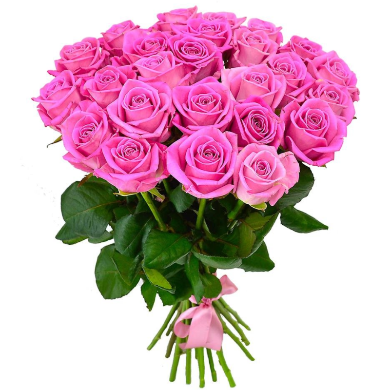 Букет состоит из 25 розовых роз, прозрачная упаковка, атласная лента.
