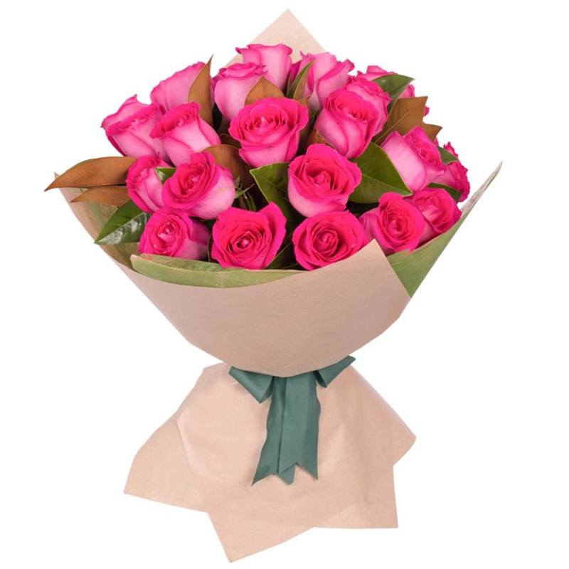 Букет состоит из 21 розовая роза, зелень, крафт, атласная лента.